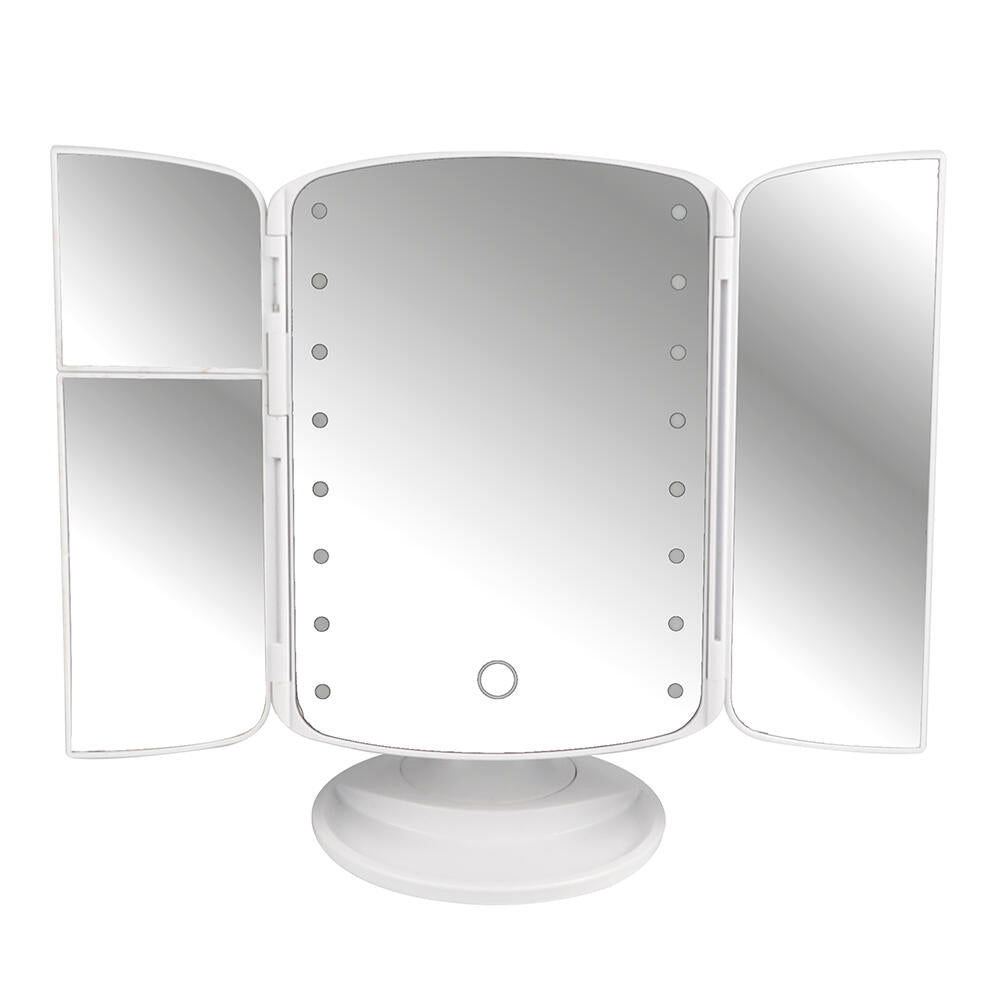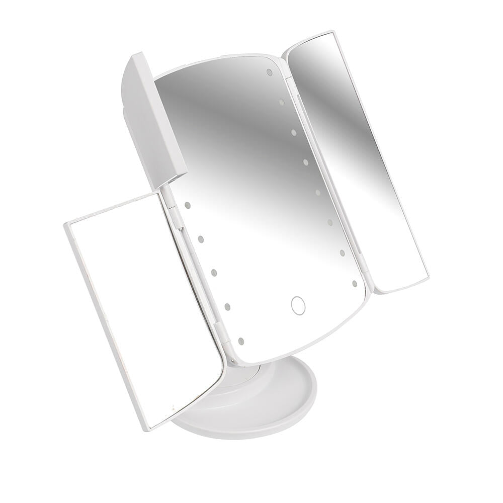 Espejo de maquillaje LED con alas laterales abatibles con luz LED.